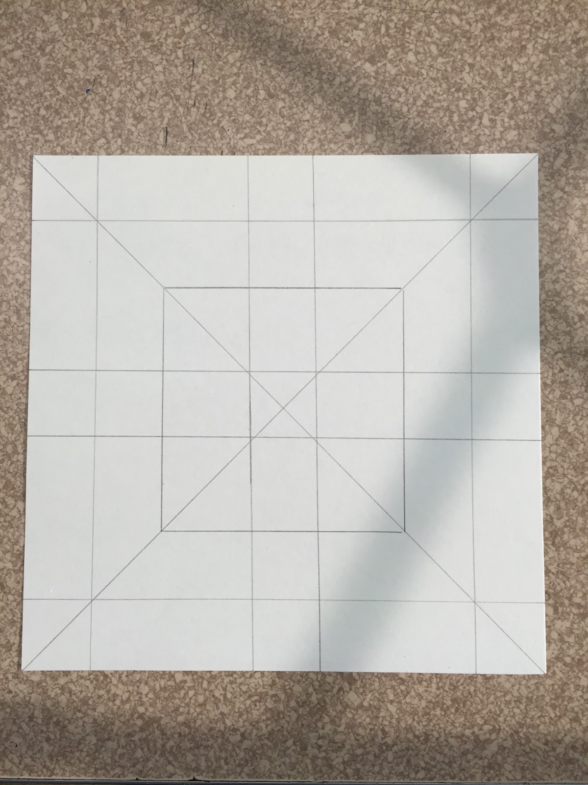 Materials – 9 x 9 inch newsprint, 9 x 9 inch white paper, pencil, ruler, templates, compass, fine tipped markers, black sharpie